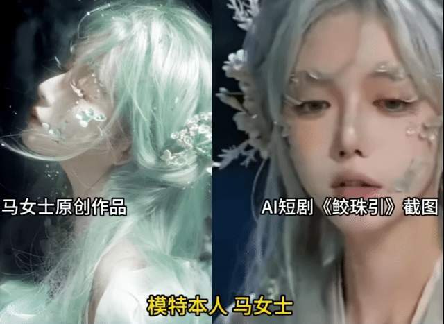 就正在不久前,一位名为马姑娘的模特也公然维权。她手工创制的衣饰、头饰遭AI短剧《鲛珠引》盗用,播放量超2300万,她自己全程不知情。