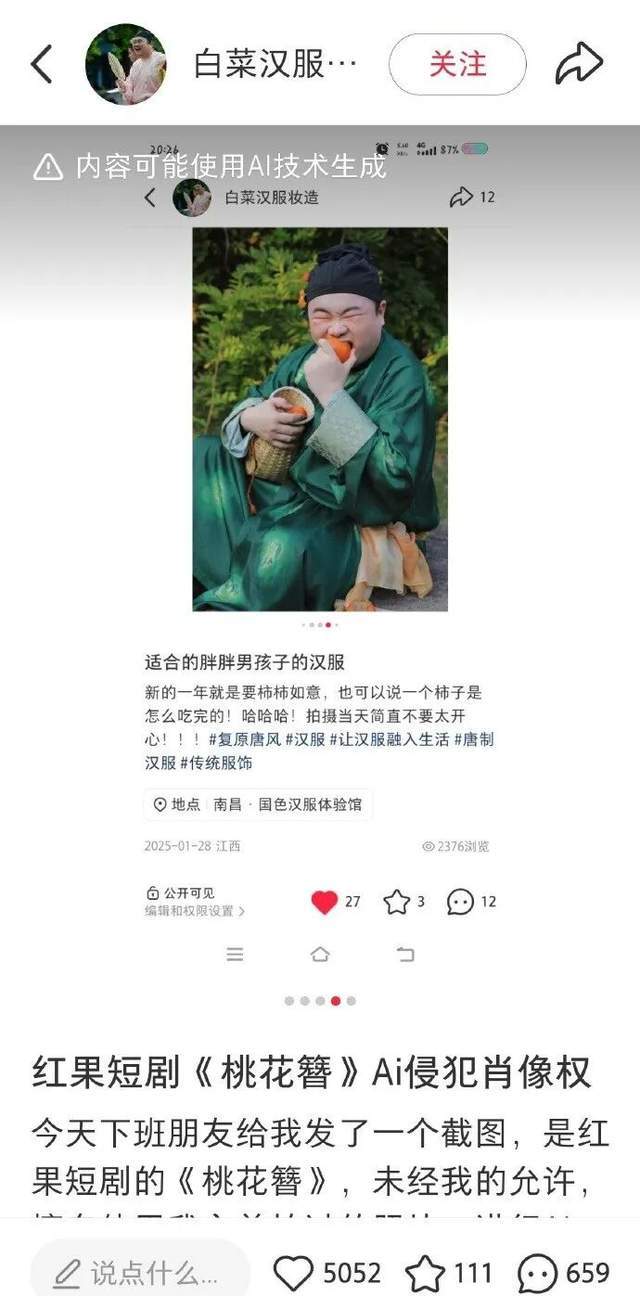 而他被盗用的照片,拍摄于2025年1月,当时正值柿子成熟季,他经心打理了妆容、计划了制型,初志只是正在小红书上分享本人的汉服平素。